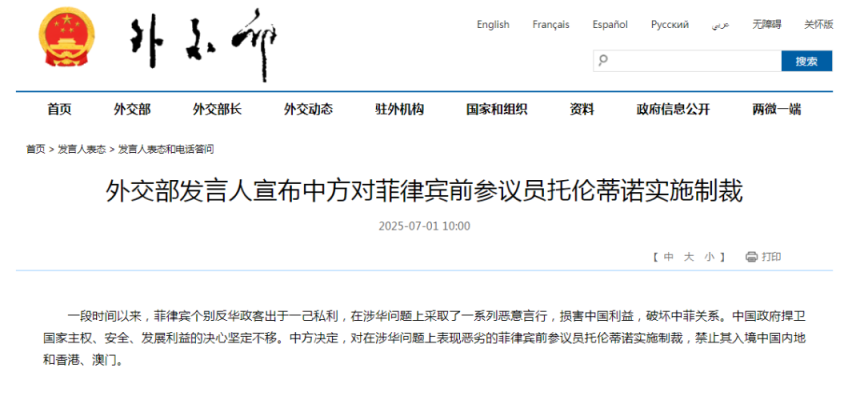 中国外交部1日在官网上发布消息称,一段时间以来,菲律宾个别反华政客出于一己私利,在涉华问题上采取了一系列恶意言行,损害中国利益,破坏中菲关系。中国政府捍卫国家主权、安全、发展利益的决心坚定不移。中方决定,对在涉华问题上表现恶劣的菲律宾前参议员托伦蒂诺实施制裁,禁止其入境中国内地和香港、澳门。
